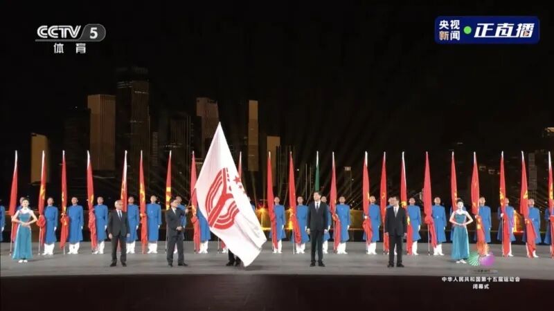 全运会会旗从澳门特首岑浩辉传到香港特首李家超手上,再传给广东省省长孟凡利及国家体育总局局长高志丹,最后交给十六届全运会主办地湖南省的省长毛伟明。