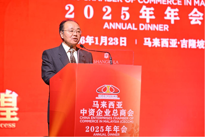 欧阳大使在致辞中高度肯定和评价总商会过去一年工作取得的成绩,对新一届当选总商会理事会班子表示热烈祝贺与殷切期望。他表示,2025年是不平凡的一年,中马关系在两国领导人战略引领下实现了新的跨越,双边经贸发展迎来更加稳定和可预期的好环境,贸易与投资展现强韧性与新活力,围绕绿色转型和数字化发展,两国企业在新能源、数据中心等领域合作明显提速。展望未来,中国经济持续向高质量发展,马加快推进产业升级转型,双方发展目标与方向高度契合,合作空间将更加广阔。他勉励总商会在新的一年里,继续团结带领在马广大中资企业,跃马扬鞭,砥砺前行,为中马关系发展做出新贡献。