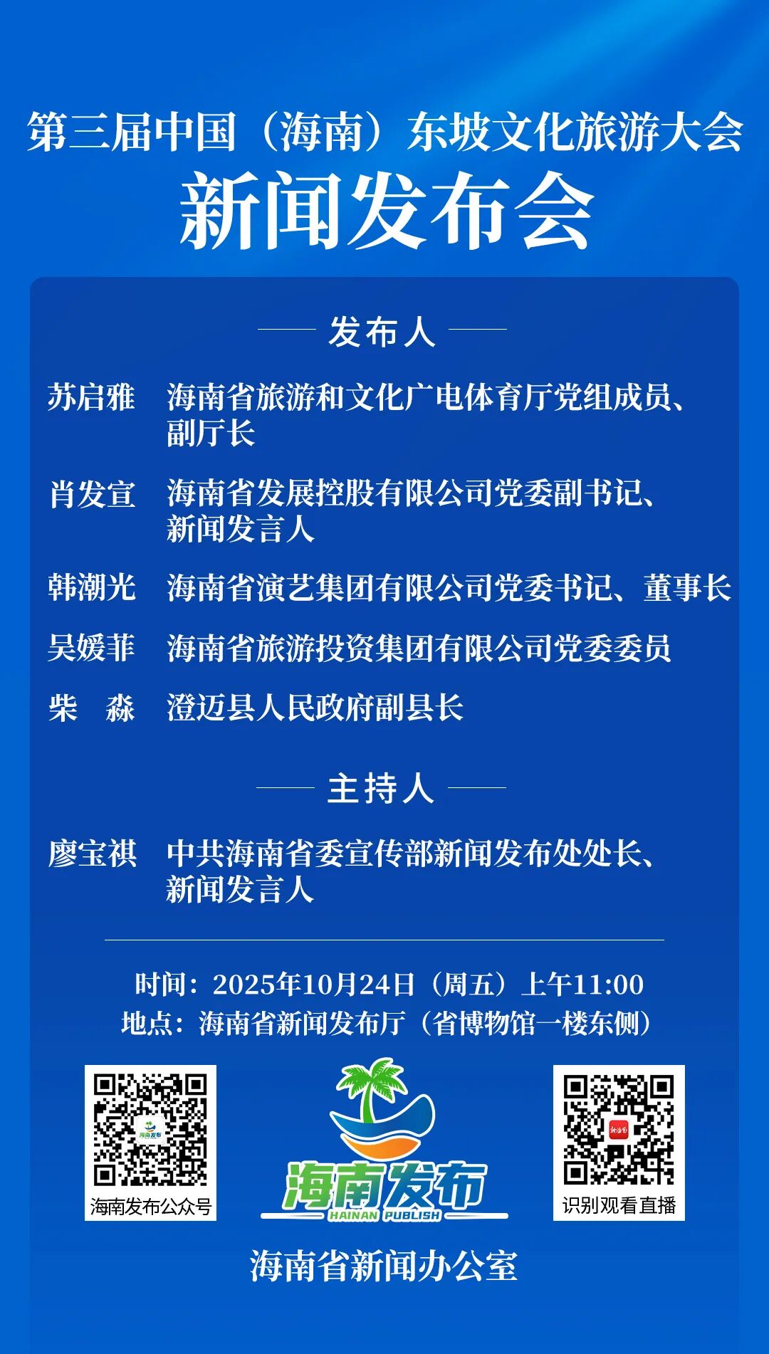 海南省新闻办公室将于2025年10月24日(星期五)上午11:00在海南省新闻发布厅(省博物馆一楼东侧)举行第三届中国(海南)东坡文化旅游大会新闻发布会,邀请海南省旅游和文化广电体育厅党组成员、副厅长苏启雅,海南省发展控股有限公司党委副书记、新闻发言人肖发宣,海南省演艺集团有限公司党委书记、董事长韩潮光,海南省旅游投资集团有限公司党委委员吴媛菲,澄迈县人民政府副县长柴淼介绍相关情况,并答记者问。